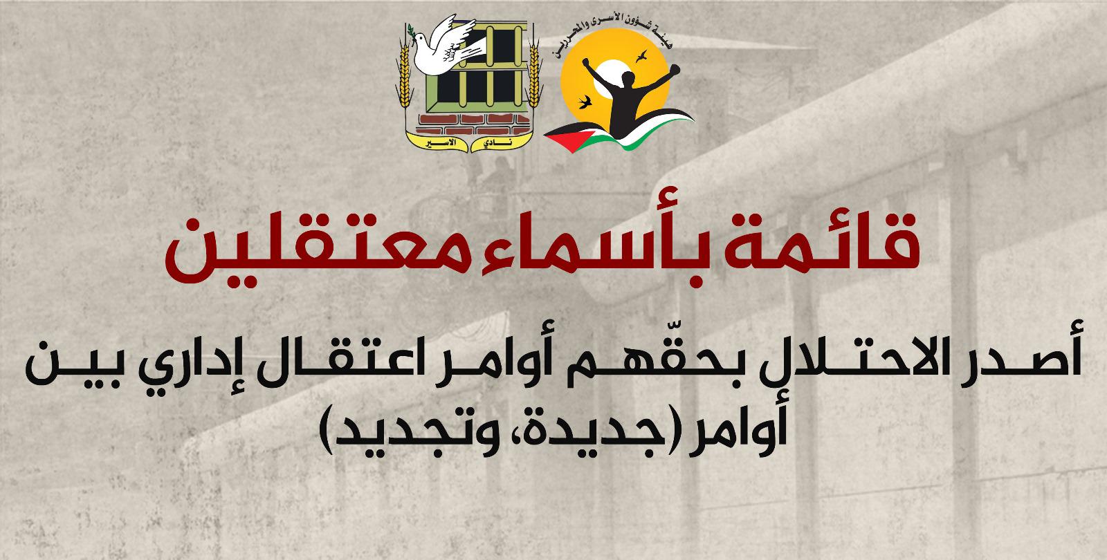 🔴 قائمة بأسماء معتقلين إداريين صدرت بحقهم أوامر اعتقال إداري بين أوامر (جديدة وتجديد)
