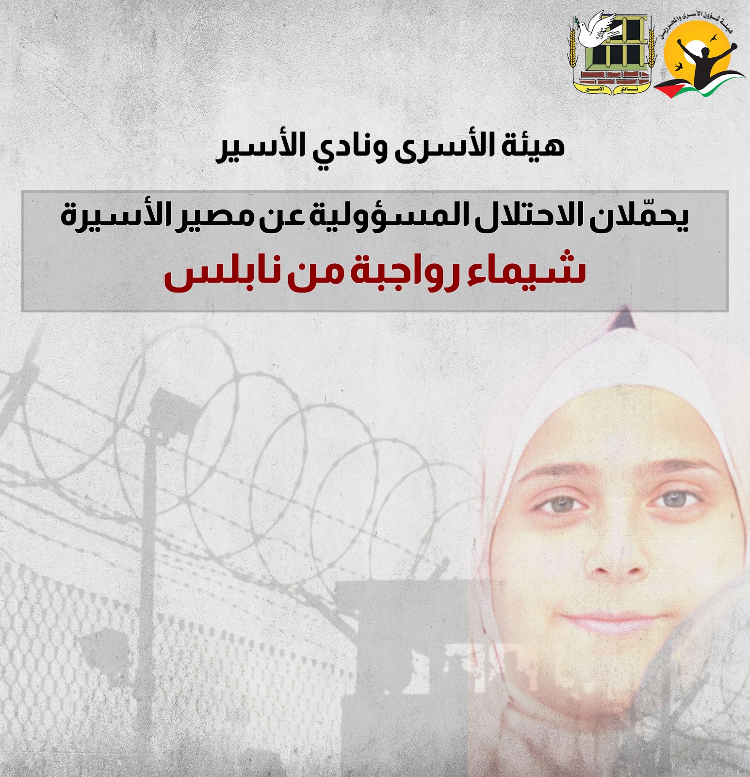 🔴 هيئة الأسرى ونادي الأسير يحمّلان الاحتلال المسؤولية عن مصير الأسيرة شيماء رواجبة من نابلس