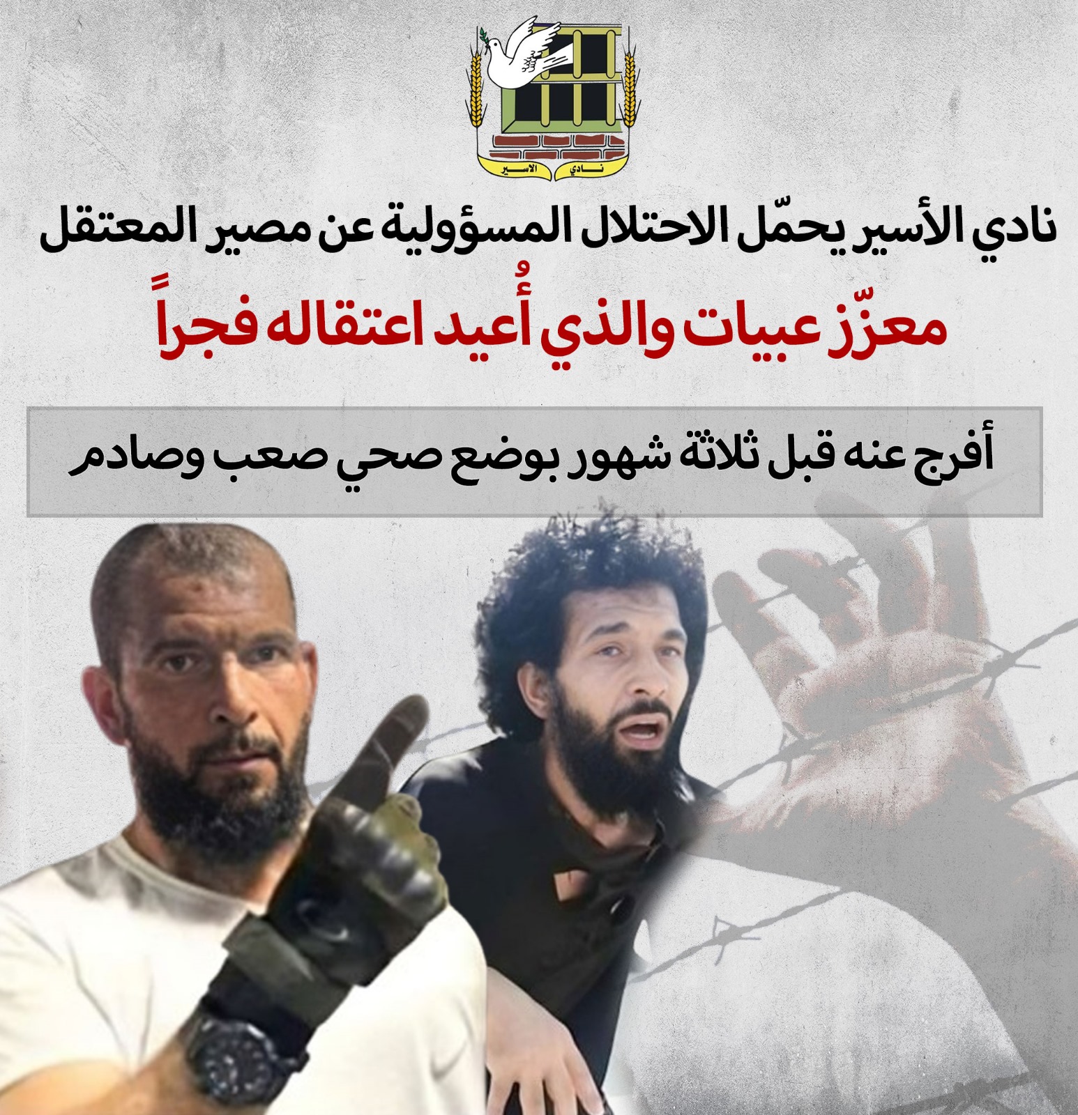 🔴 نادي الأسير يحمّل الاحتلال المسؤولية عن مصير المعتقل معزّز عبيات والذي أُعيد اعتقاله فجراً