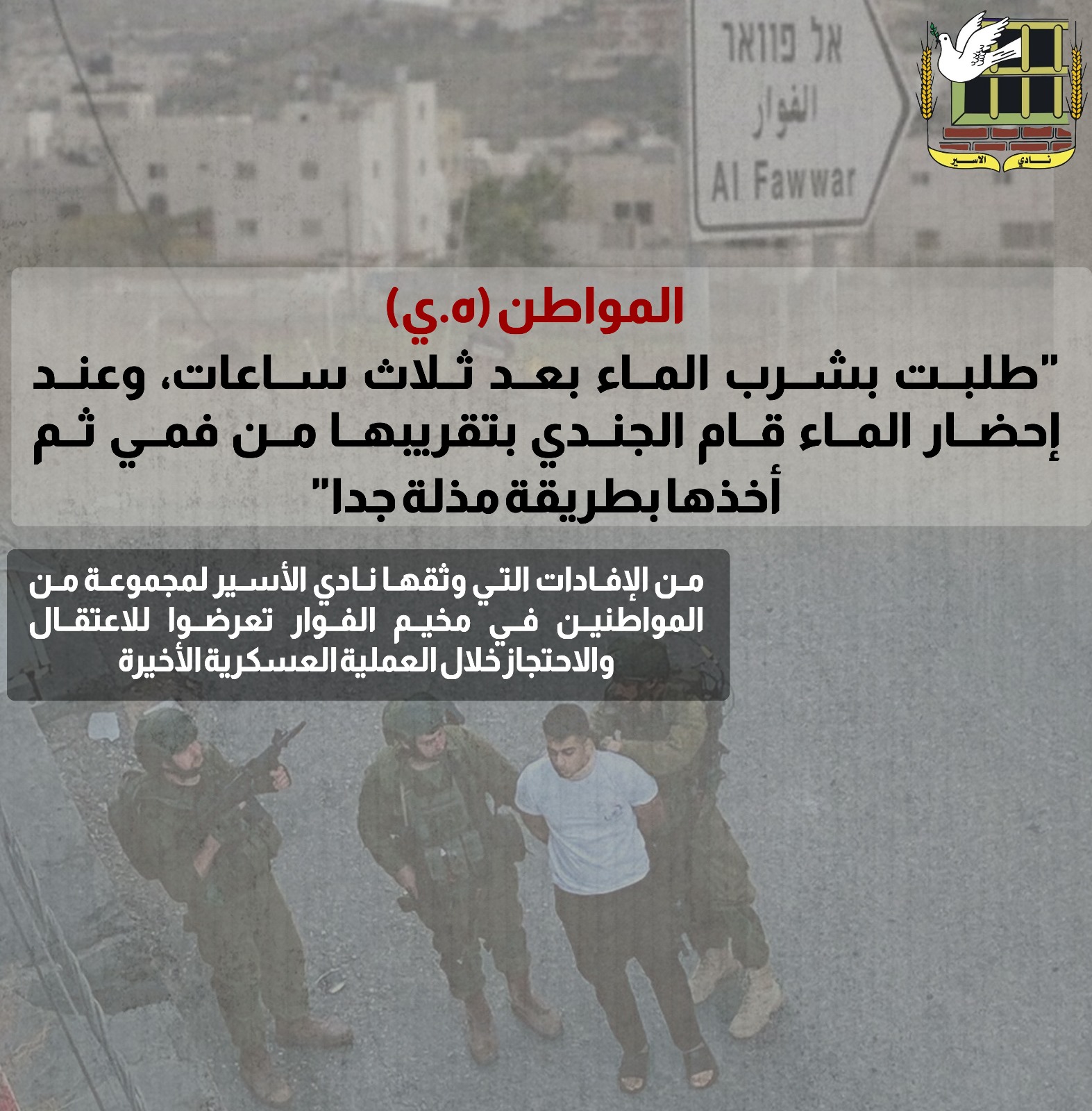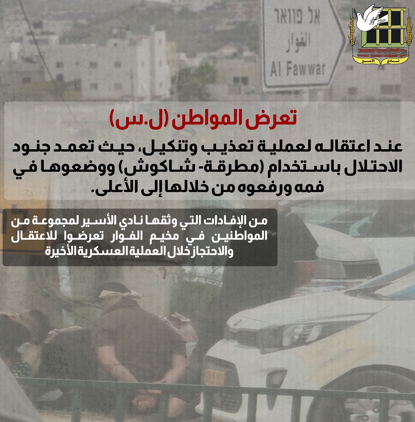 🔴 من الإفادات التي وثقها نادي الأسير مع مواطنين من مخيم الفوار تعرضوا للاعتقال والتحقيق