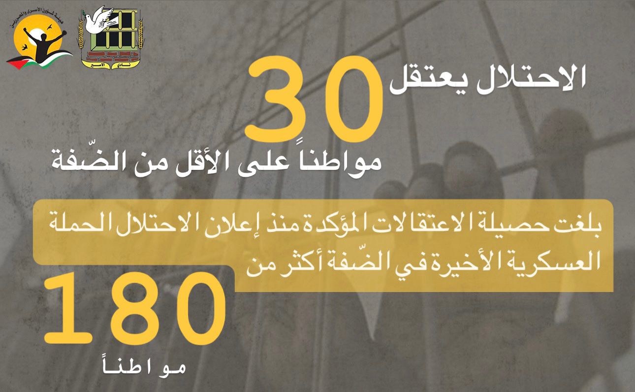 📌 بلغت حصيلة الاعتقالات المؤكدة منذ إعلان الاحتلال الحملة العسكرية الأخيرة في الضّفة أكثر من (180) مواطناً