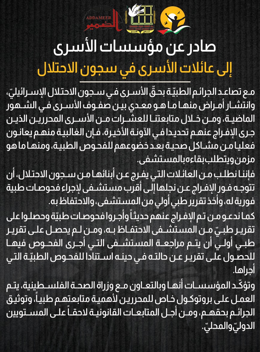 🔴 صادر عن هيئة شؤون الأسرى والمحررين ونادي الأسير الفلسطيني