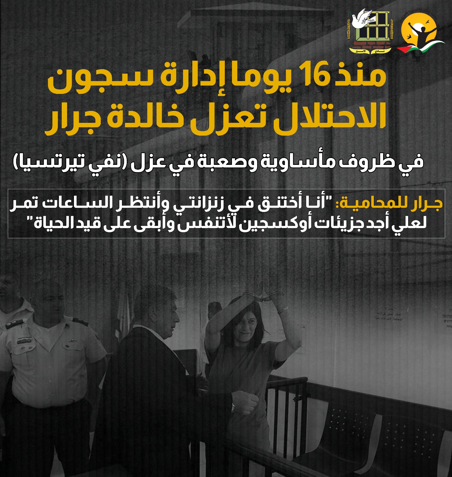 منذ 16 يوما إدارة سجون الاحتلال تعزل خالدة جرار في ظروف مأساوية وصعبة في عزل (نفي تيرتسيا)