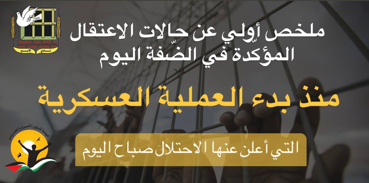 🔴 ملخص أولي عن حالات الاعتقال المؤكّدة في الضّفة اليوم منذ بدء العملية العسكرية التي أعلن عنها الاحتلال صباح اليوم