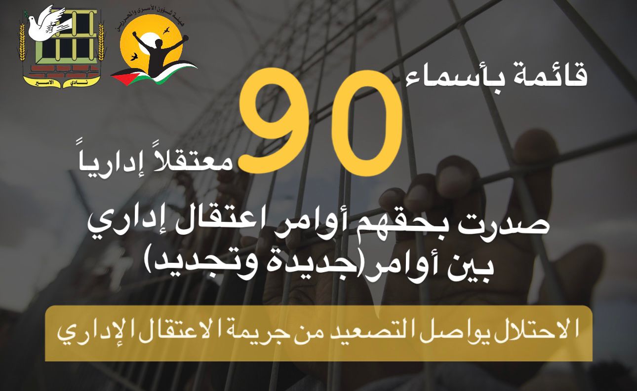 🔴 قائمة بأسماء 90 معتقلا إداريا صدرت بحقهم أوامر اعتقال إداري بين أوامر (جديدة وتجديد)، من بينهم زوج الشهيدة وفاء جرار
