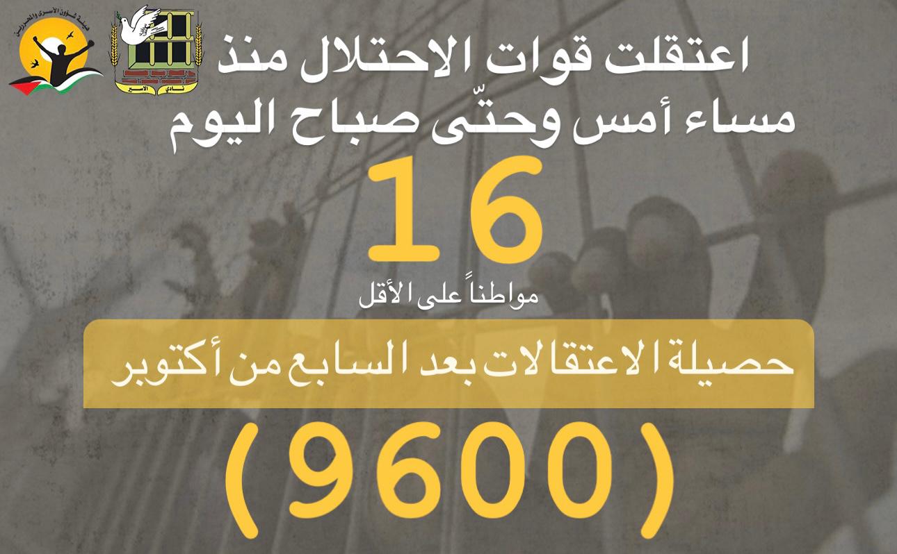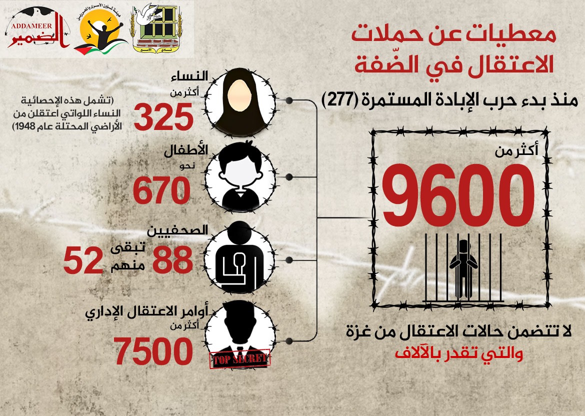 •بلغت حصيلة حملات الاعتقال أكثر من (9600) في الضّفة بما فيها القدس.