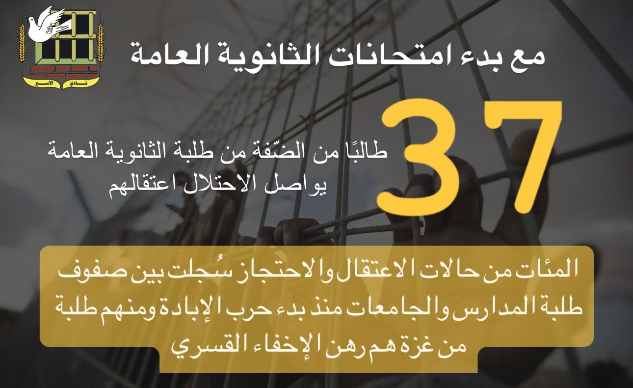 🔴 37 طالبًا من طلبة الثانوية العامة في الضّفة يواصل الاحتلال اعتقالهم في سجونه