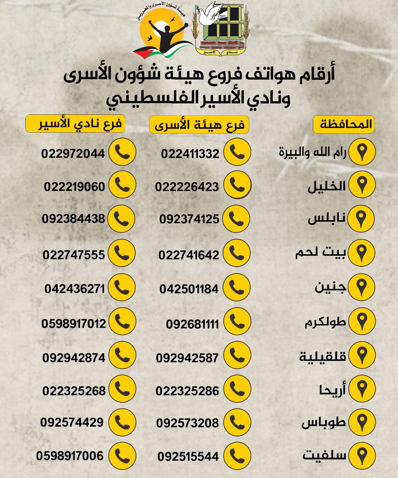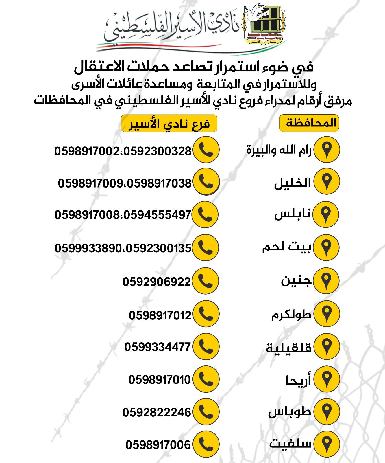 📌 في ضوء استمرار تصاعد حملات الاعتقال والاستمرار في المتابعة وأخذ الملاحظات من العائلات مرفق أرقام لمدراء فروع نادي الأسير الفلسطيني في المحافظات