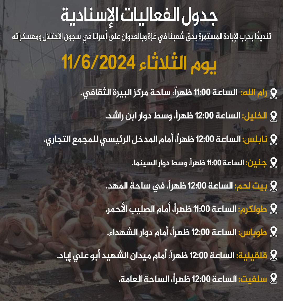 🔴 دعوات للمشاركة الفعالة في مراكز المدن الثلاثاء القادم تنديدًا بحرب الإبادة المستمرة بحقّ شعبنا في غزة وبالعدوان على أسرانا في سجون الاحتلال ومعسكراته