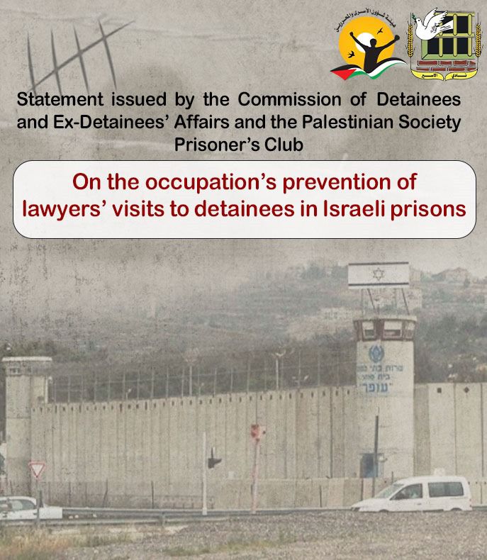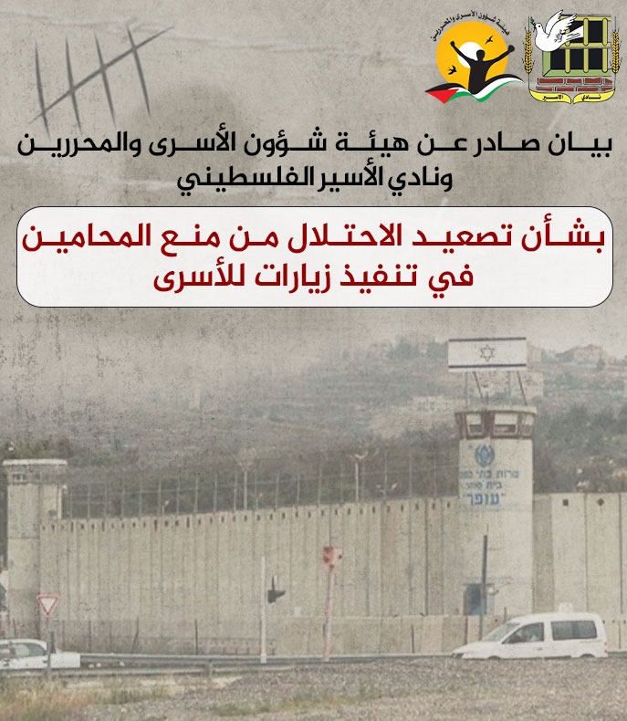 🔴 بيان صادر عن هيئة شؤون الأسرى والمحررين ونادي الأسير الفلسطيني بشأن تصعيد الاحتلال من منع المحامين في تنفيذ زيارات للأسرى