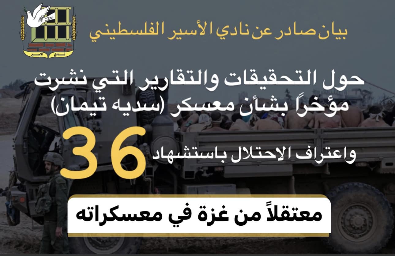 بيان صادر عن نادي الأسير الفلسطيني حول التحقيقات والتقارير التي نشرت مؤخرًا بشأن معسكر (سديه تيمان) واعتراف الاحتلال باستشهاد 36 معتقلا من غزة في معسكراته