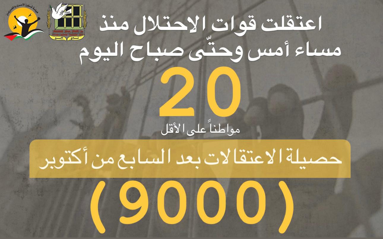 📌 الاحتلال يعتقل 20 مواطناً على الأقل من الضّفة