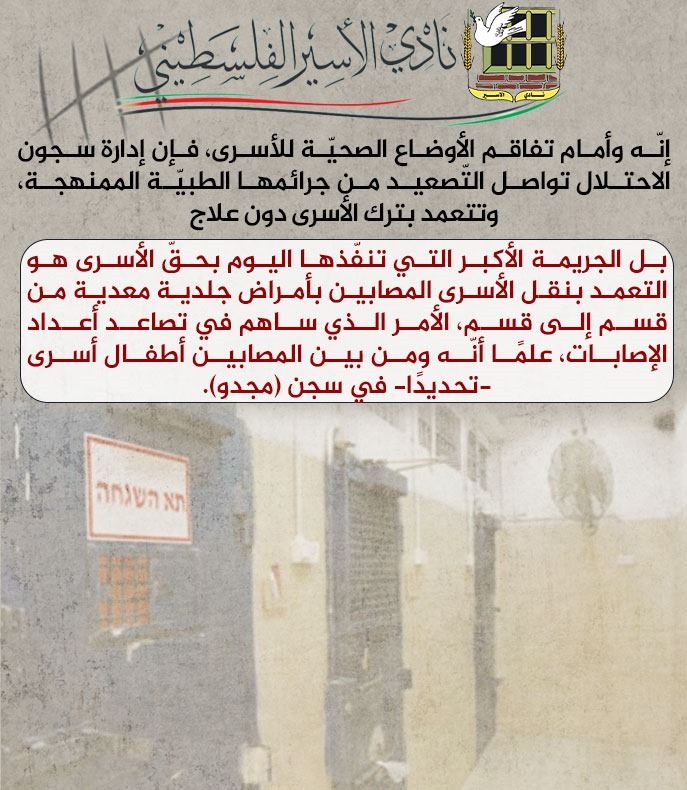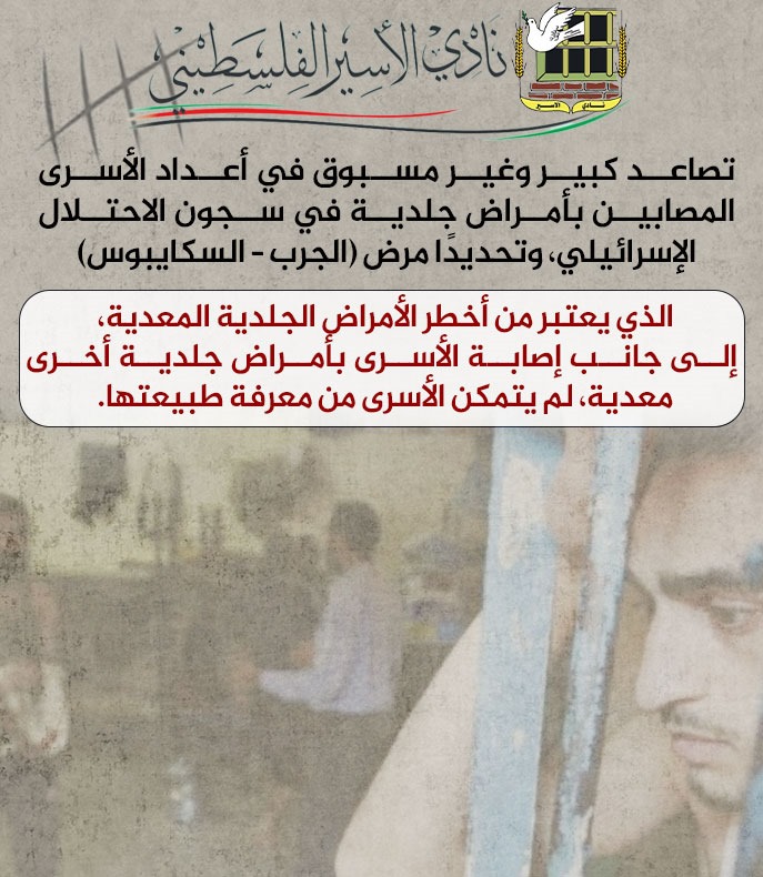 🔴 نادي الأسير: تصاعد كبير في أعداد الأسرى المصابين بأمراض جلدية معدية وتحديدًا (السكايبوس) من بينهم أسرى أطفال