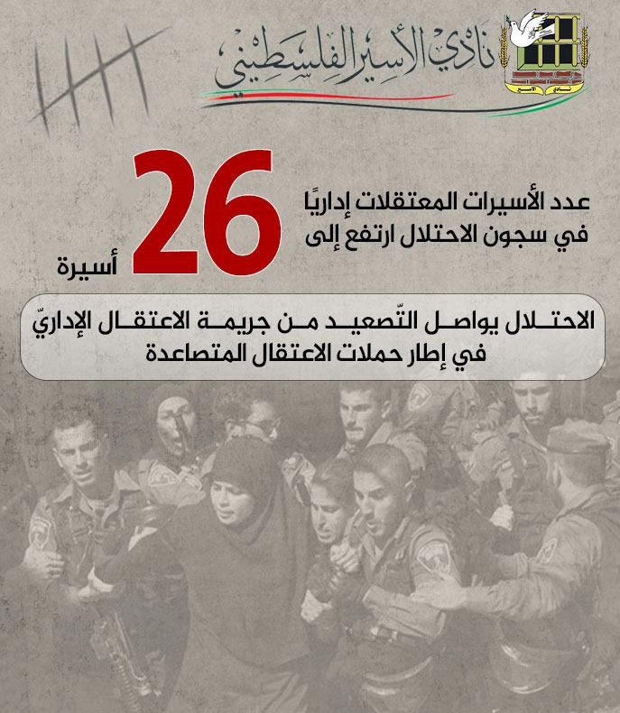 🔴 نادي الأسير: ارتفاع عدد الأسيرات المعتقلات إداريًا في سجون الاحتلال إلى (26) أسيرة
