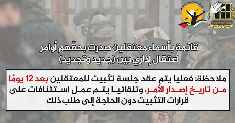 🔴 مرفق قائمة بأسماء معتقلين إداريين صدرت بحقهم أوامر اعتقال إداري ما بين (جديد، وتجديد)