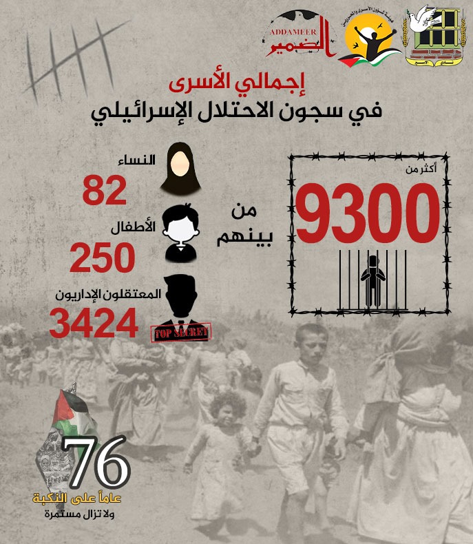 مؤسسات الأسرى: يبلغ إجمالي الأسرى في سجون الاحتلال الإسرائيلي أكثر من 9300، من بينهم أكثر من 3400 معتقل إداري، وأكثر من 80 أسيرة، وأكثر من 250 طفلًا.