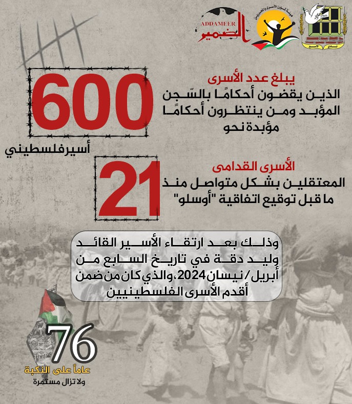 مؤسسات الأسرى: يبلغ عدد الأسرى الذين يقضون أحكامًا بالسّجن المؤبد ومن يُتوقع أن تصدر بحقهم أحكامًا بالسجن المؤبد 600 في سجون الاحتلال. المزيد من التفاصيل