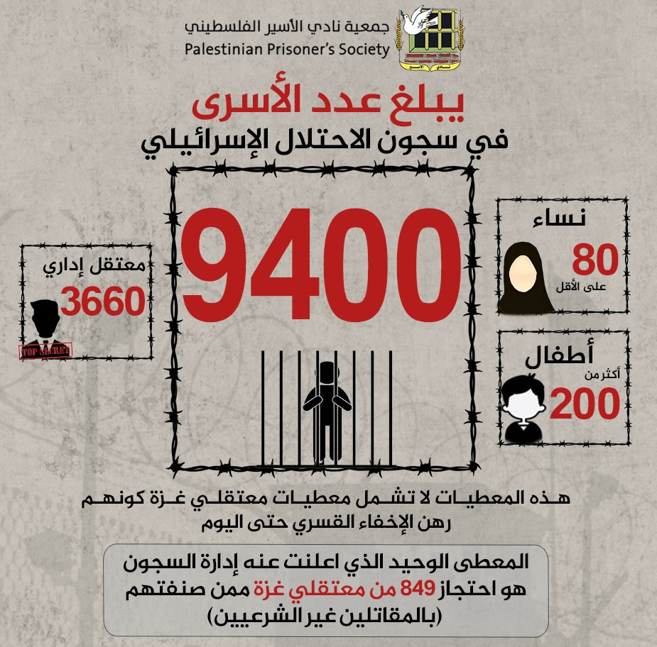 🔴 يبلغ عدد الأسرى في سجون الاحتلال الإسرائيلي أكثر من 9400 أسير، من بينهم 80 أسيرة على الأقل، واكثر من 200 طفل، وأكثر من 3660 معتقل إداري