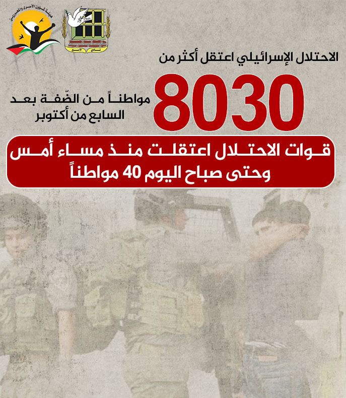 🔴 الاحتلال الإسرائيلي اعتقل أكثر من 8030 مواطناً من الضّفة بعد السابع من أكتوبر