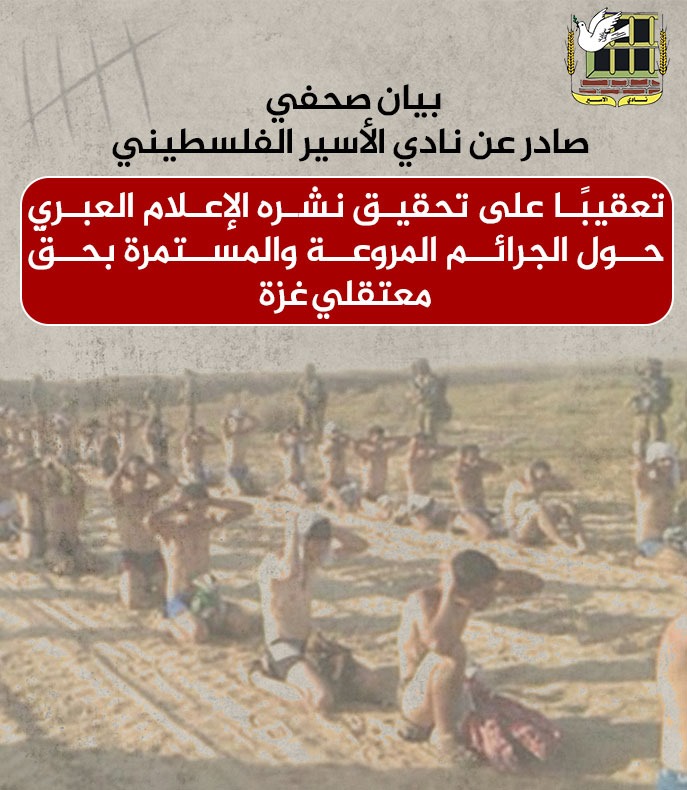 🔴 بيان صحفي صادر عن نادي الأسير الفلسطيني تعقيبًا على تحقيق نشره الإعلام العبري حول الجرائم المروعة والمستمرة بحقّ معتقلي غزة