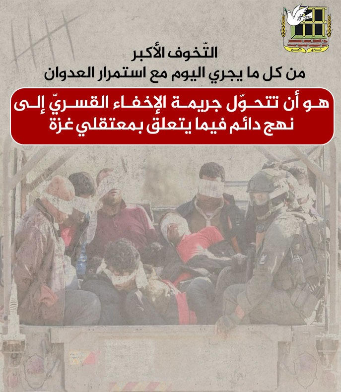 نادي الأسير: "إنّ التّخوف الأكبر من كل ما يجري اليوم بحق معتقلي غزة مع استمرار العدوان، هو أن تتحوّل جريمة الإخفاء القسريّ إلى نهج دائم المزيد من التفاصيل
