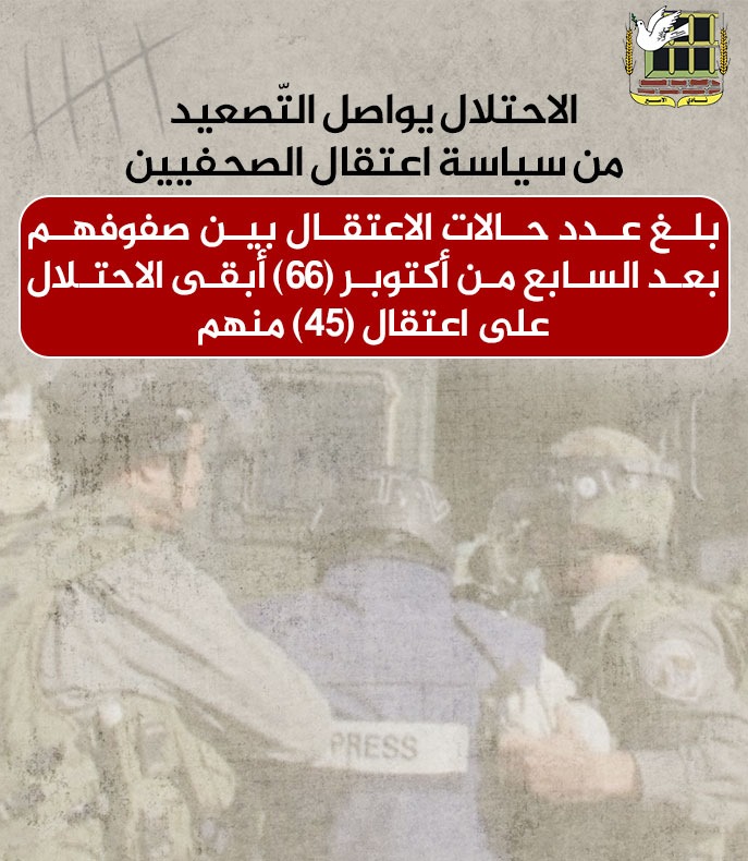 🔴 ارتفاع عدد الصحفيات المعتقلات إلى (4) وهم من بين (66) صحفيا/ة تعرضوا للاعتقال بعد السابع من أكتوبر