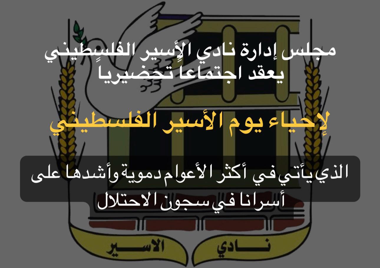 📌 مجلس إدارة نادي الأسير الفلسطيني يعقد اجتماعاً تحضيرياً لإحياء يوم الأسير الفلسطيني الذي يأتي في أكثر الأعوام دموية وأشدها على أسرانا في سجون الاحتلال
