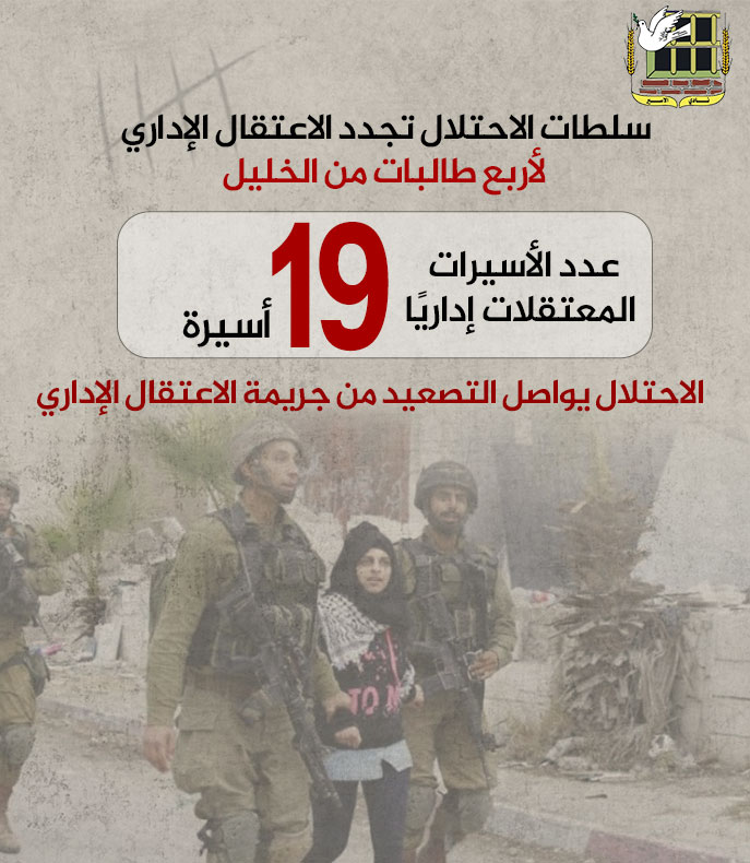 🔴 نادي الأسير: سلطات الاحتلال تجدد الاعتقال الإداري لأربع طالبات من الخليل