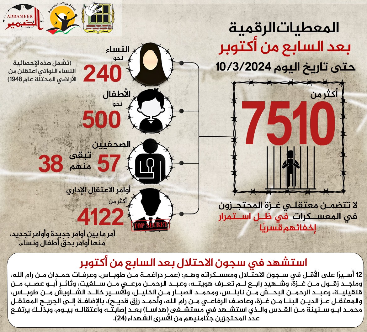 🔴 ملخص معطيات حملات الاعتقال بعد السابع من أكتوبر حتى تاريخ اليوم 10/3/2024