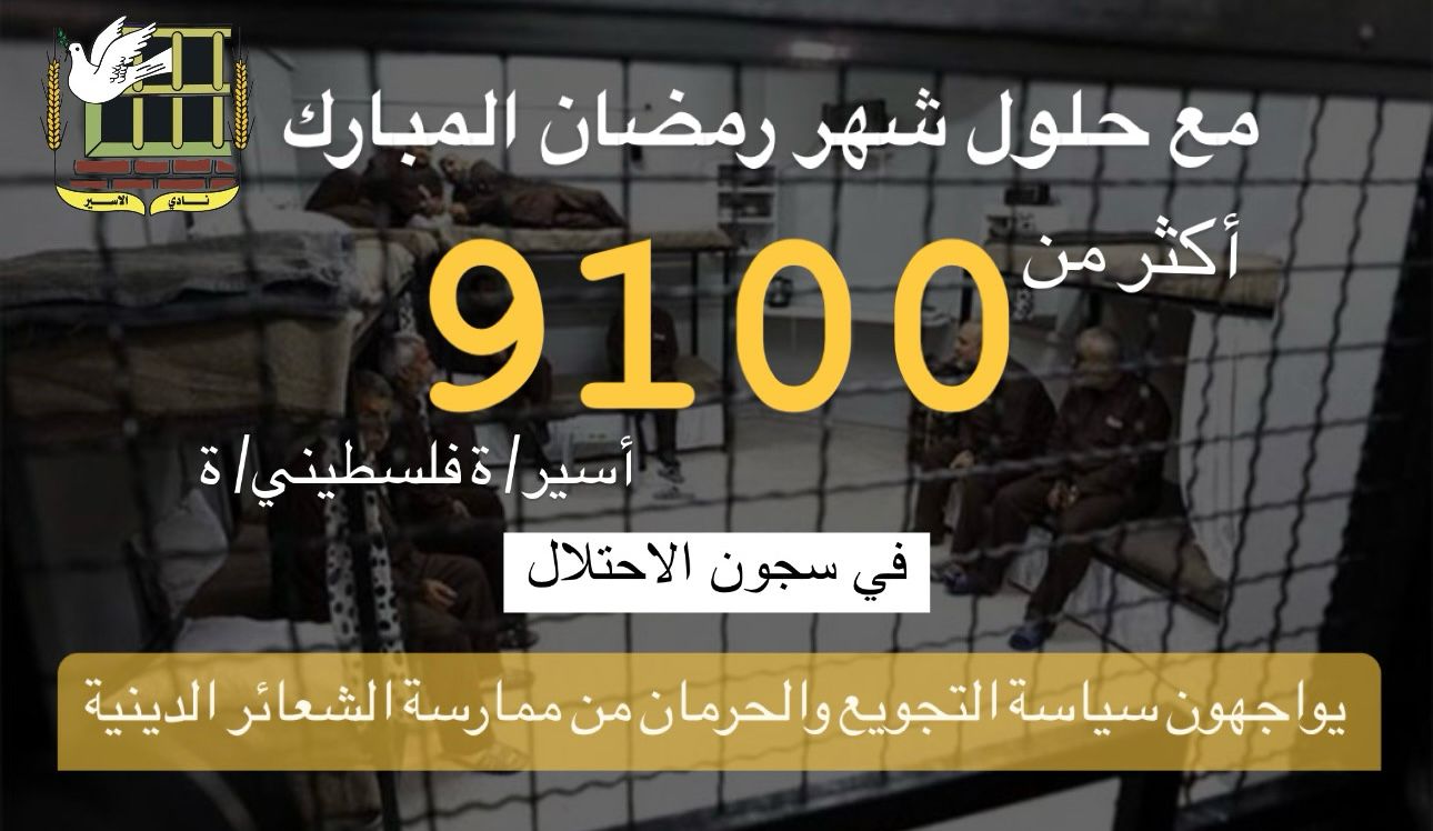 📌 نادي الأسير: أكثر من 9100 أسير/ ة فلسطيني/ ة في سجون الاحتلال يواجهون سياسة التّجويع والحرمان من ممارسة الشعائر الدينية