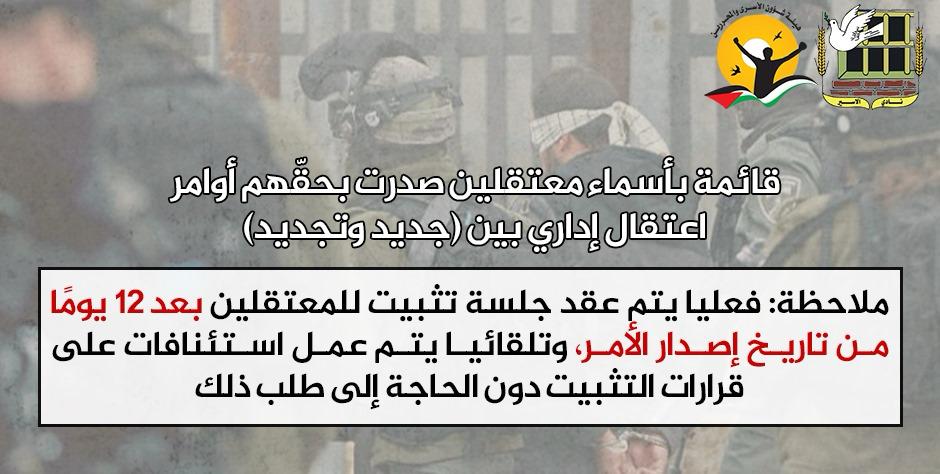 🔴 قائمة بأسماء معتقلين إداريين صدر بحقّهم أوامر اعتقال إداري بين جديدة وتجديد