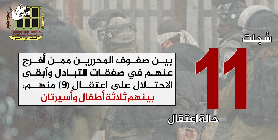 🔴 نادي الأسير: سُجلت (11) حالة اعتقال بين صفوف المحررين ممن أفرج عنهم في صفقات التبادل وأبقى الاحتلال على اعتقال (9) منهم، بينهم ثلاثة أطفال وأسيرتان