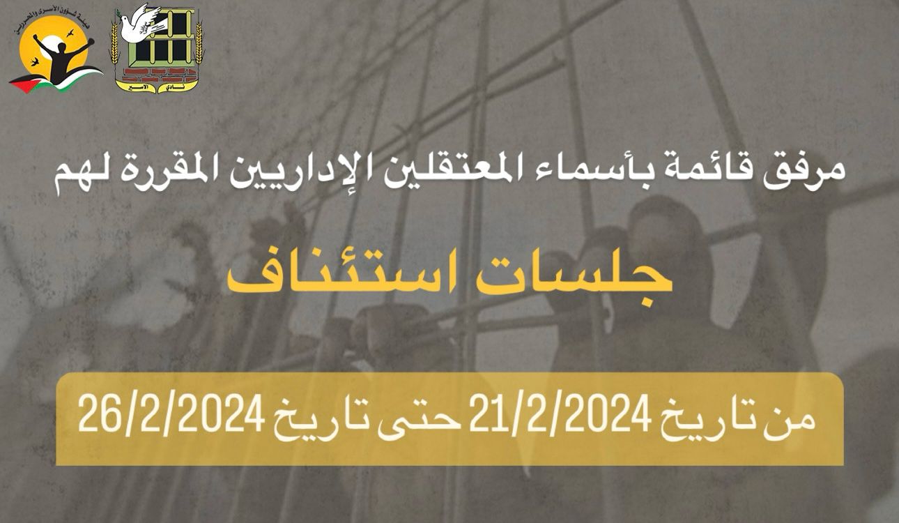 📌 مرفق قائمة بأسماء المعتقلين الإداريين المقررة لهم جلسات استئناف من تاريخ 21/2/2024 حتى تاريخ 26/2/2024