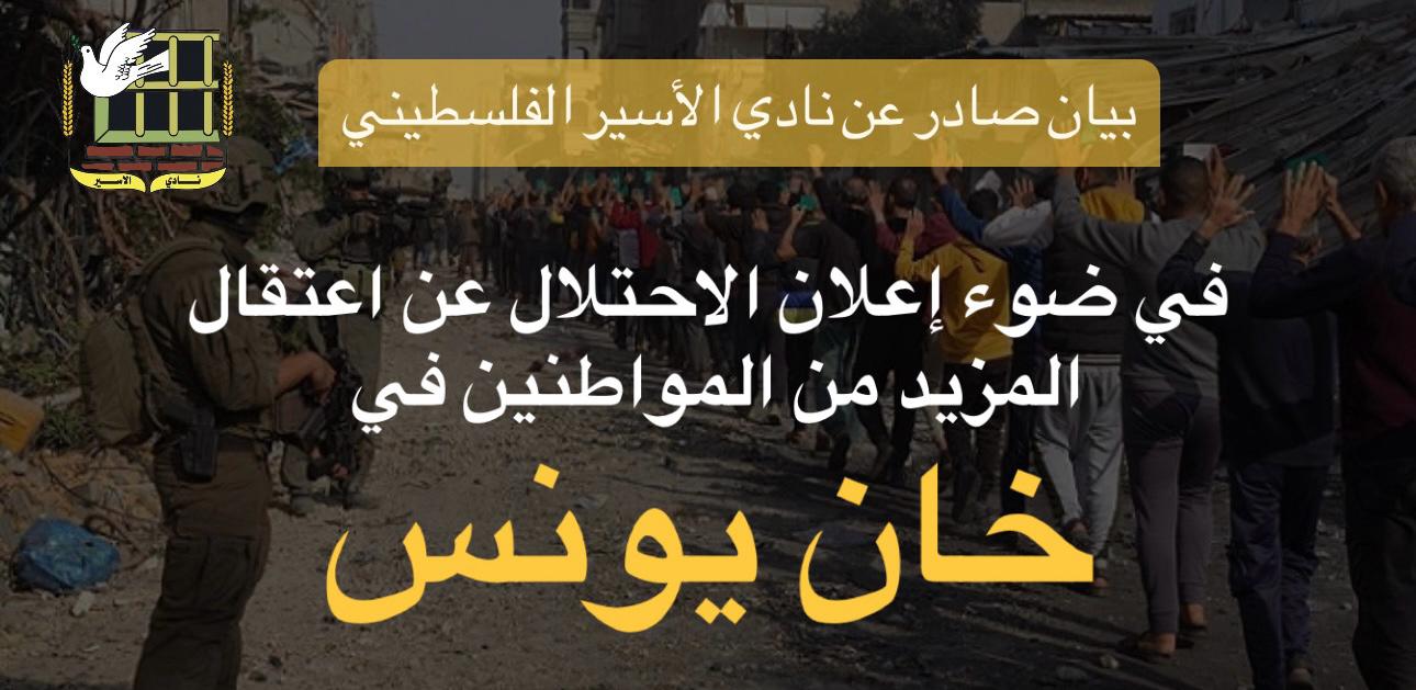 بيان صادر عن نادي الأسير الفلسطيني في ضوء إعلان الاحتلال عن اعتقال المزيد من المواطنين في خان يونس