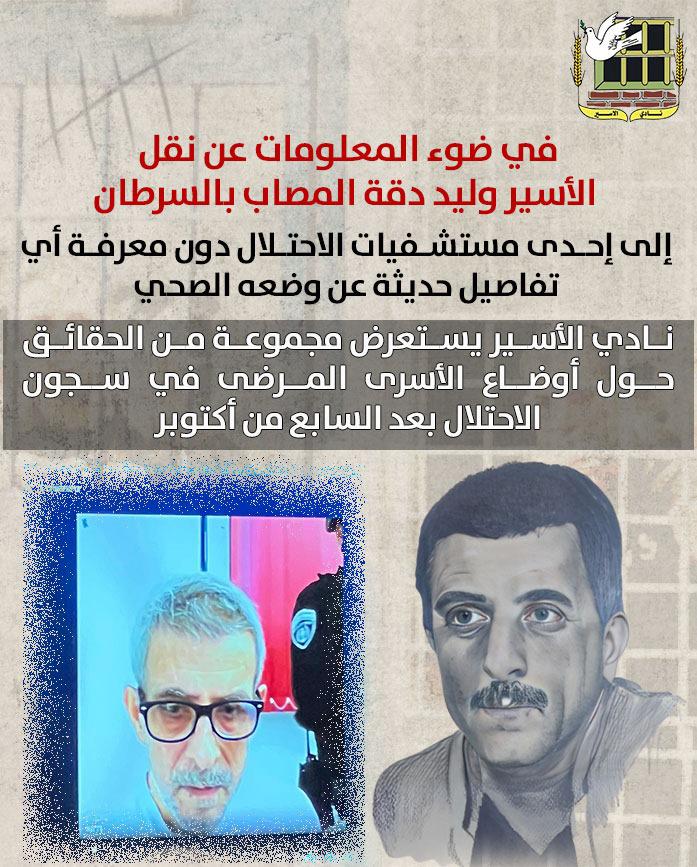 في ضوء المعلومات عن نقل الأسير وليد دقة المصاب بالسرطان إلى إحدى مستشفيات الاحتلال مؤخراً دون معرفة أي تفاصيل حديثة عن وضعه الصحي
