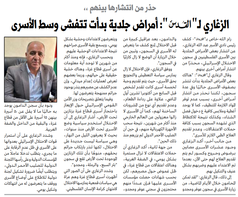 الزغاري لـ" القدس " : أمراض جلدية بدأت تتفشى وسط الأسرى