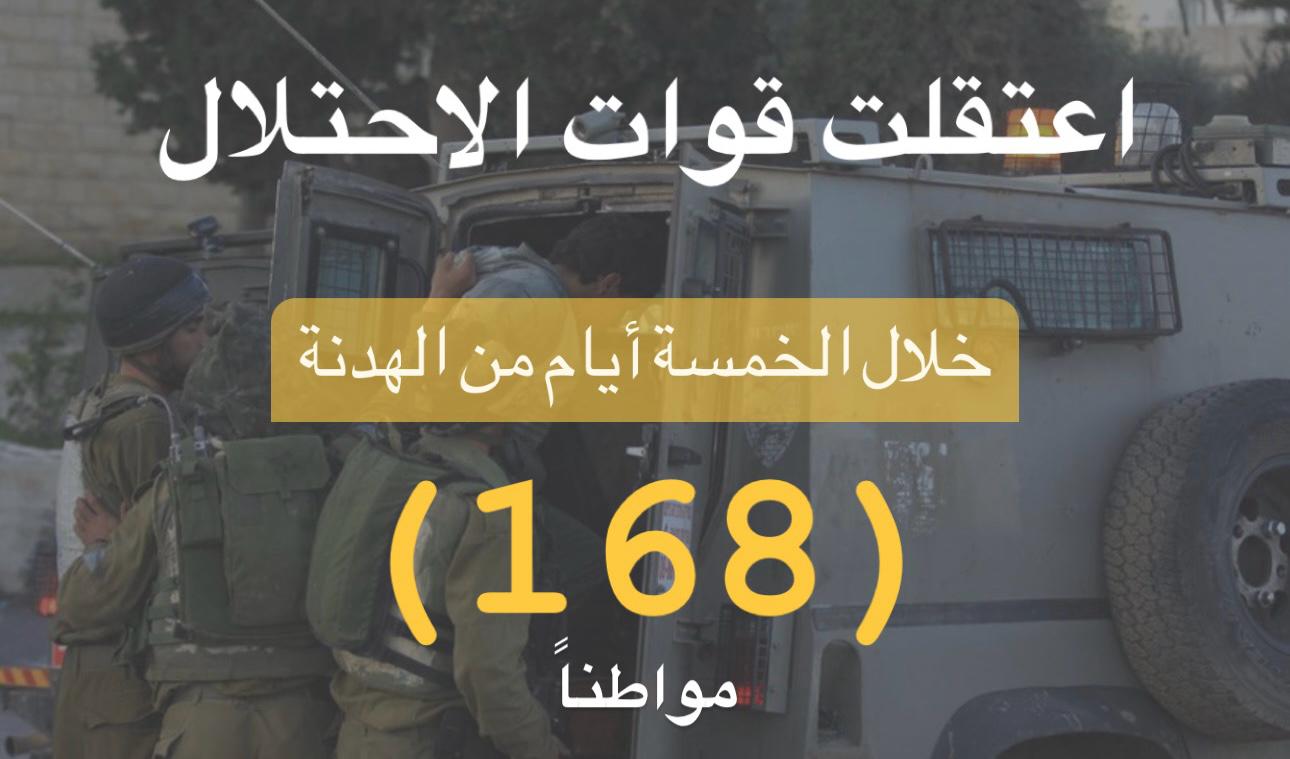 نادي الأسير: اعتقلت قوات الاحتلال خلال الخمسة أيام من الهدنة (168) مواطناً.