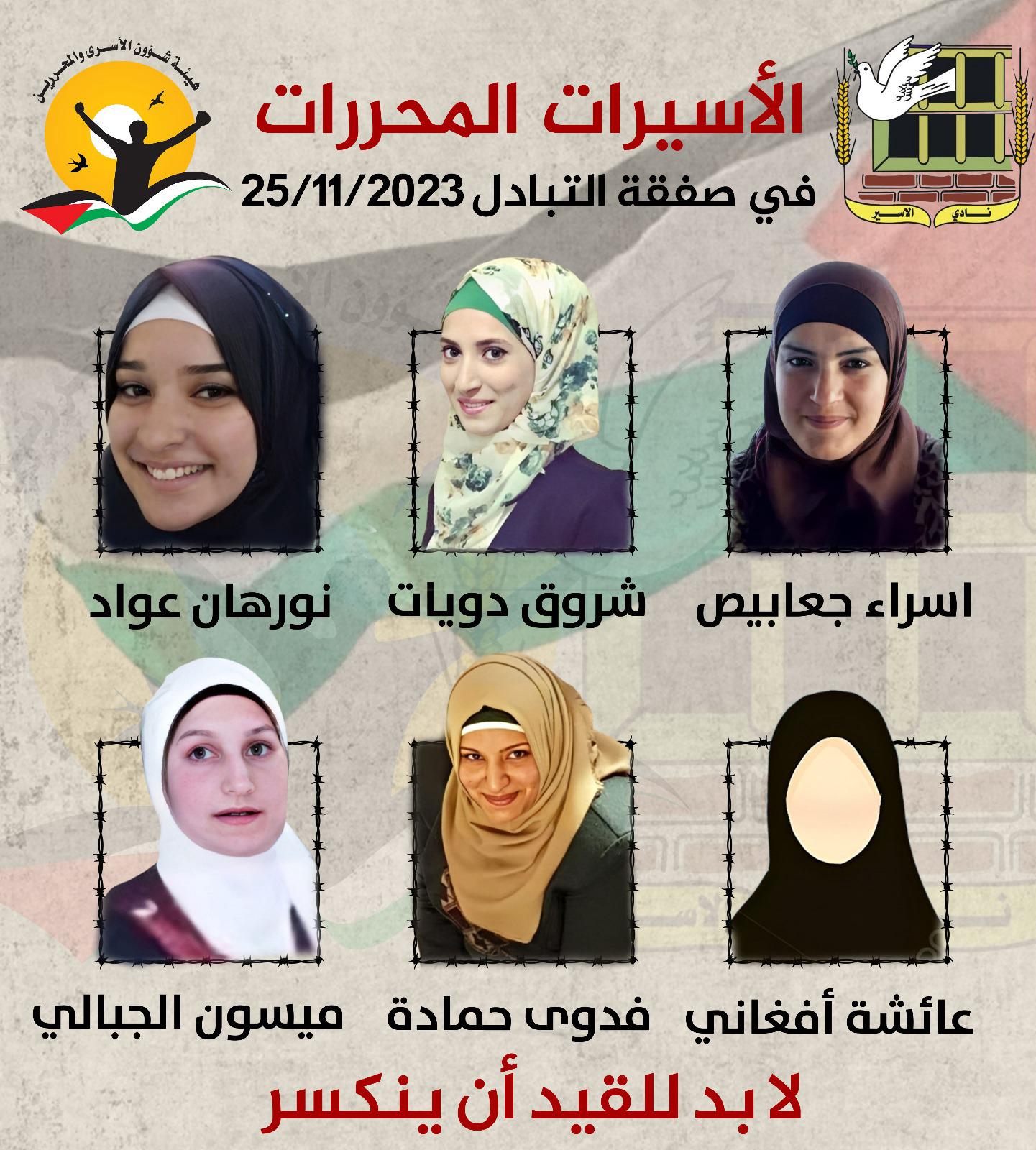 الأسيرات المحررات اللواتي سيتم الإفراج عنهنّ اليوم السبت ضمن الدفعة الثانية من صفقة التبادل: