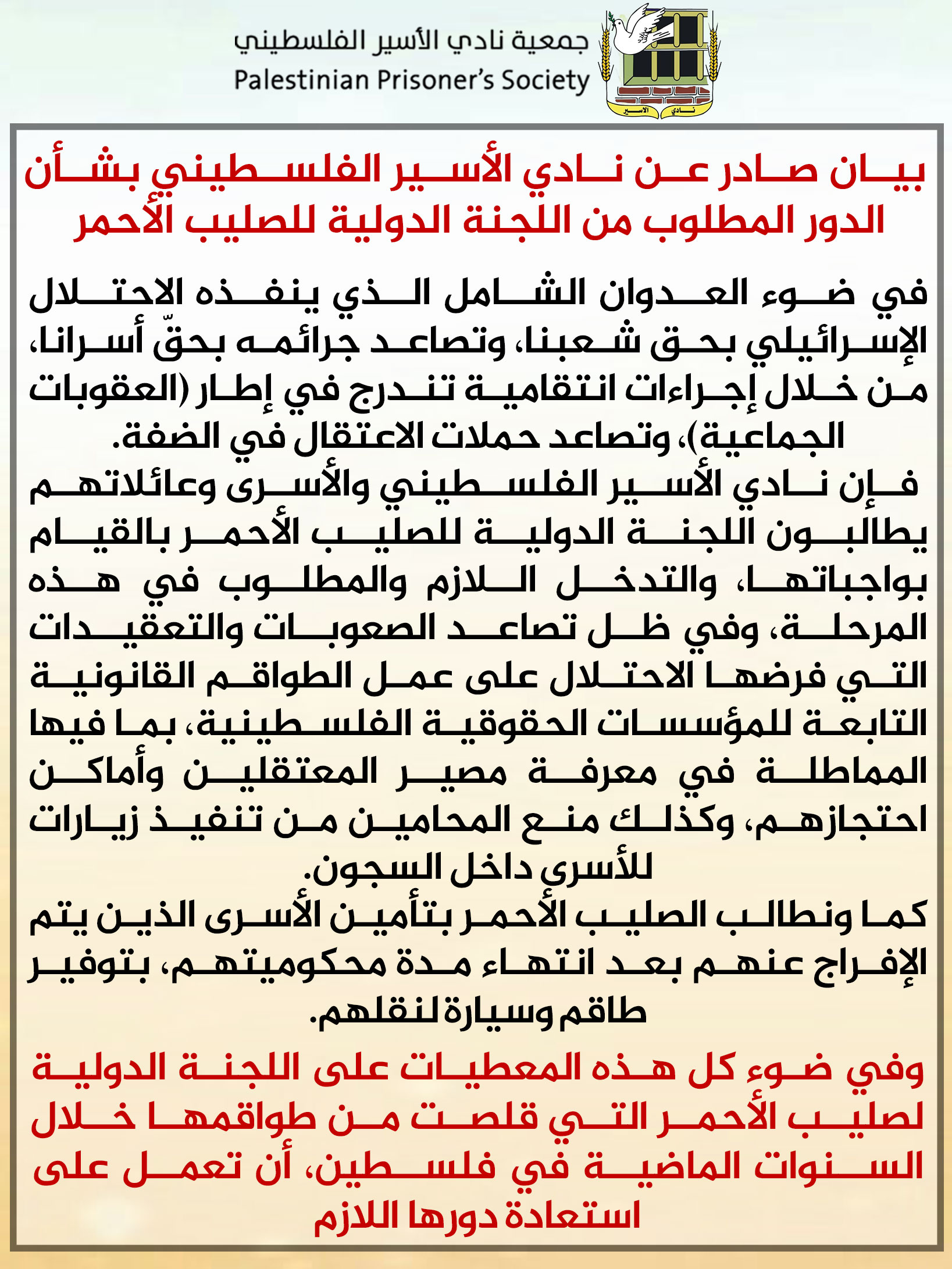 بيان صادر عن نادي الأسير الفلسطيني بشأن الدور المطلوب من اللجنة الدولية للصليب الأحمر