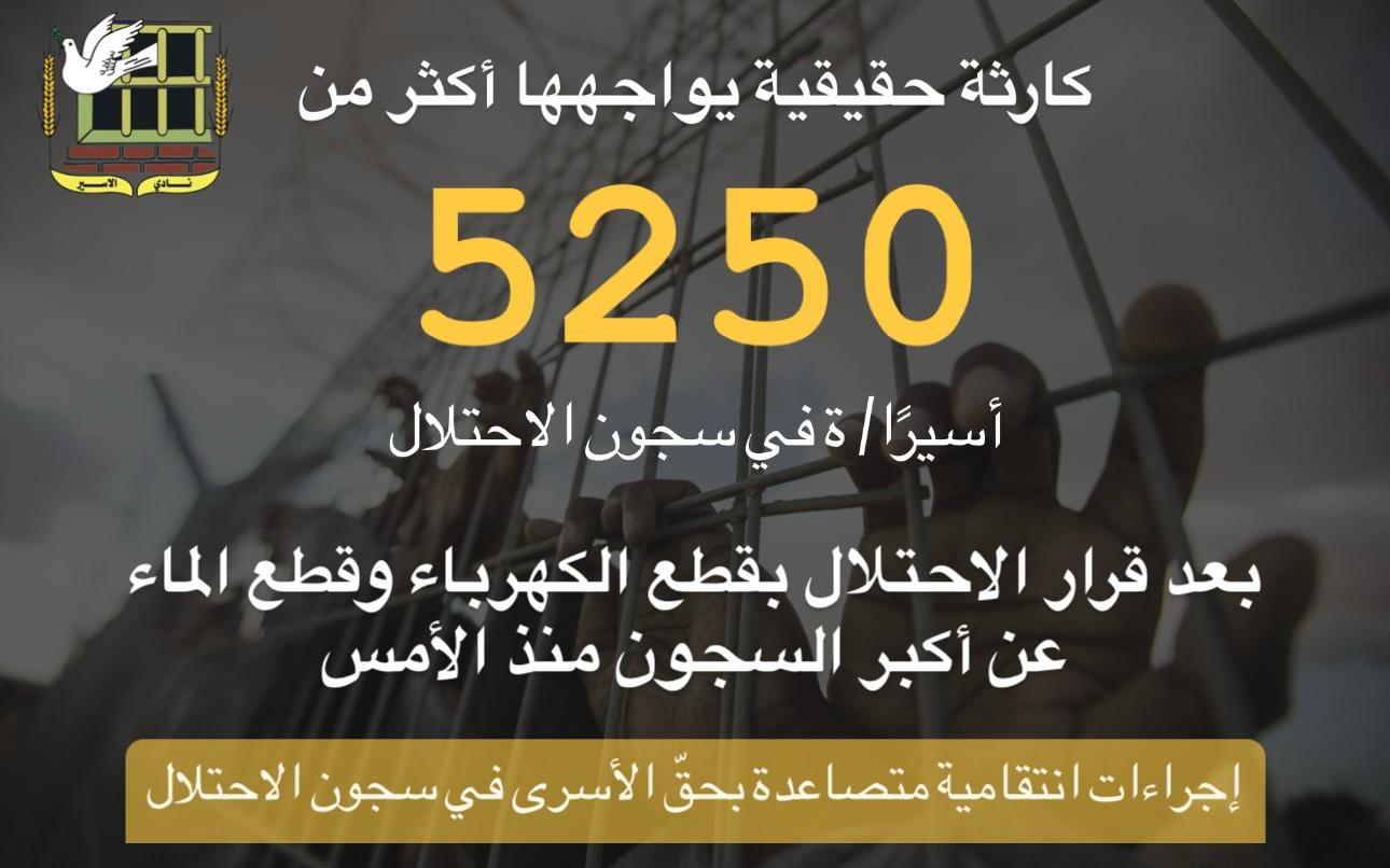 نادي الأسير: كارثة حقيقية يواجهها أكثر من 5250 أسيرًا/ ة في سجون الاحتلال بعد قرار الاحتلال بقطع الكهرباء وقطع الماء عن أكبر السجون منذ الأمس