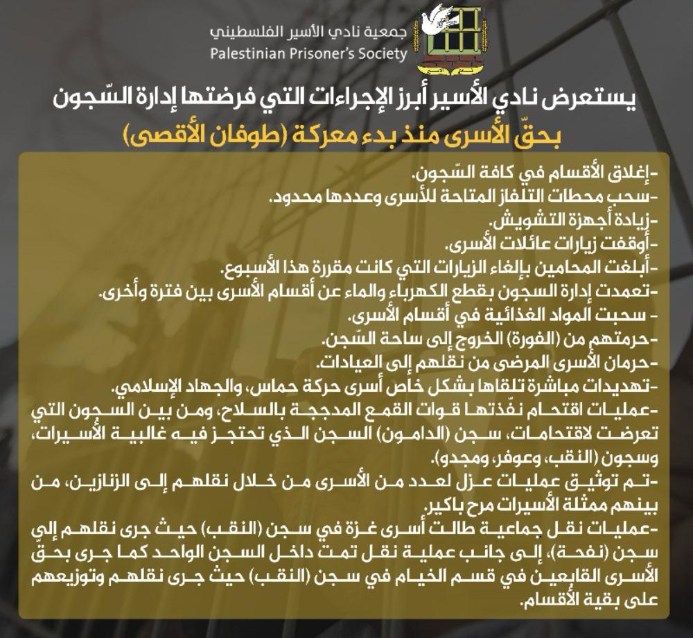 يستعرض نادي الأسير أبرز الإجراءات التي فرضتها إدارة السّجون بحق الأسرى منذ بدء معركة (طوفان الأقصى)