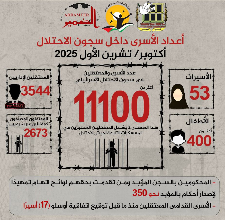 📌 معطيات وإحصائيات حول أعداد الأسرى داخل سجون الاحتلال – أكتوبر/ تشرين الأول 2025