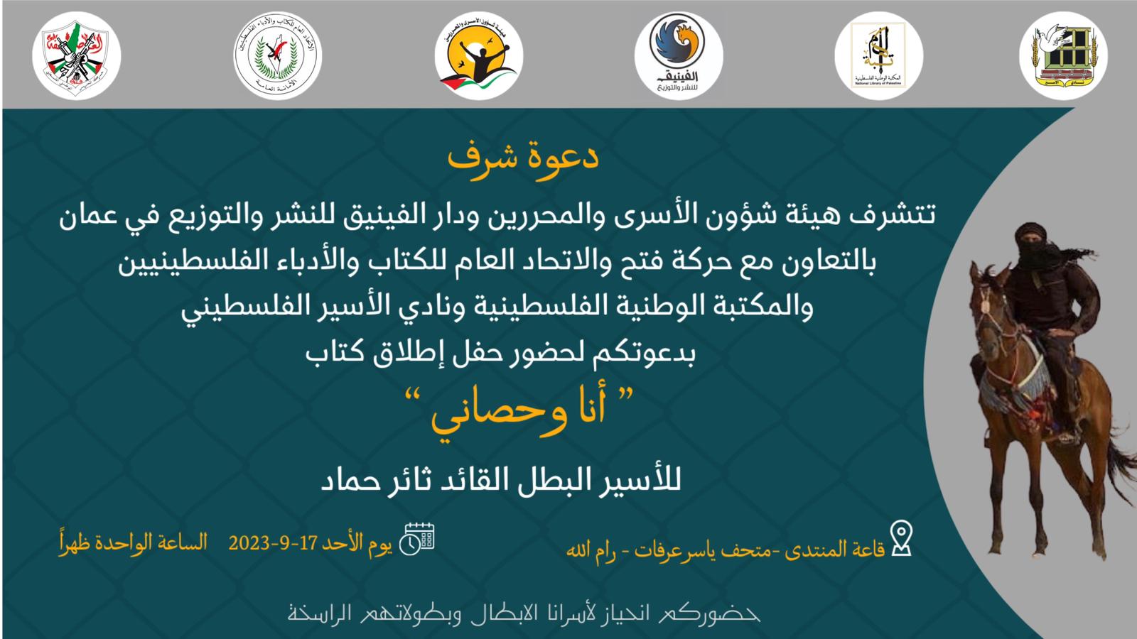 دعوة لإطلاق كتاب للأسير البطل ثائر حماد (أنا وحصاني)، غدًا الأحد في متحف ياسر عرفات، الساعة الواحدة ظهرا