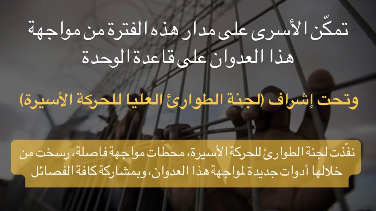 تمكّن الأسرى على مدار هذه الفترة من مواجهة هذا العدوان على قاعدة الوحدة، وتحت إشراف (لجنة الطوارئ العليا للحركة الأسيرة)، المزيد من التفاصيل