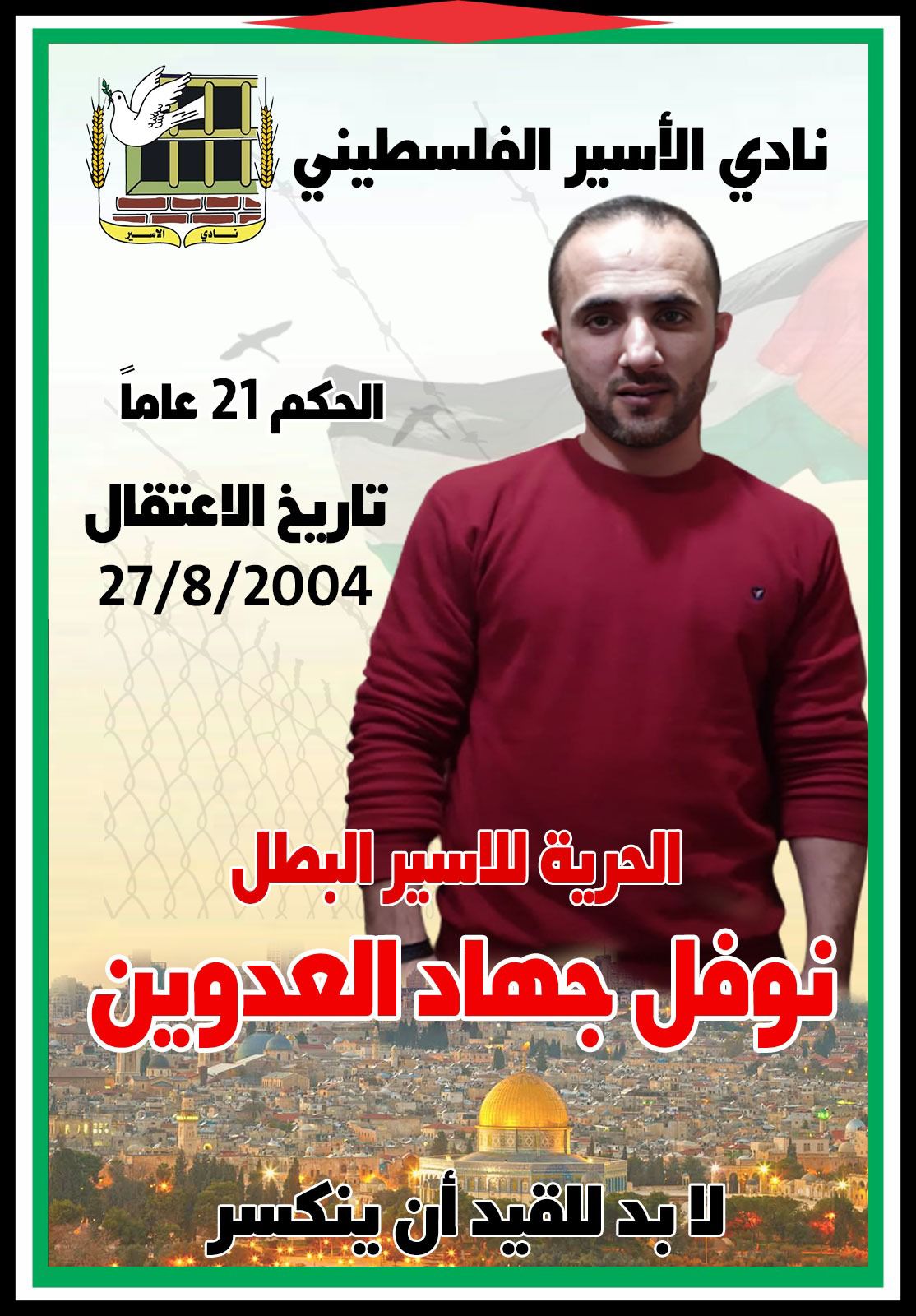 نادي الأسيـر: دخل الأسيـر نوفل جهاد العدوين من مخيم العزة/بيت لحم عامه الـ21 والأخير في سجون الاحتلال الإسرائيلي، وذلك منذ اعتقاله في عام 2003.