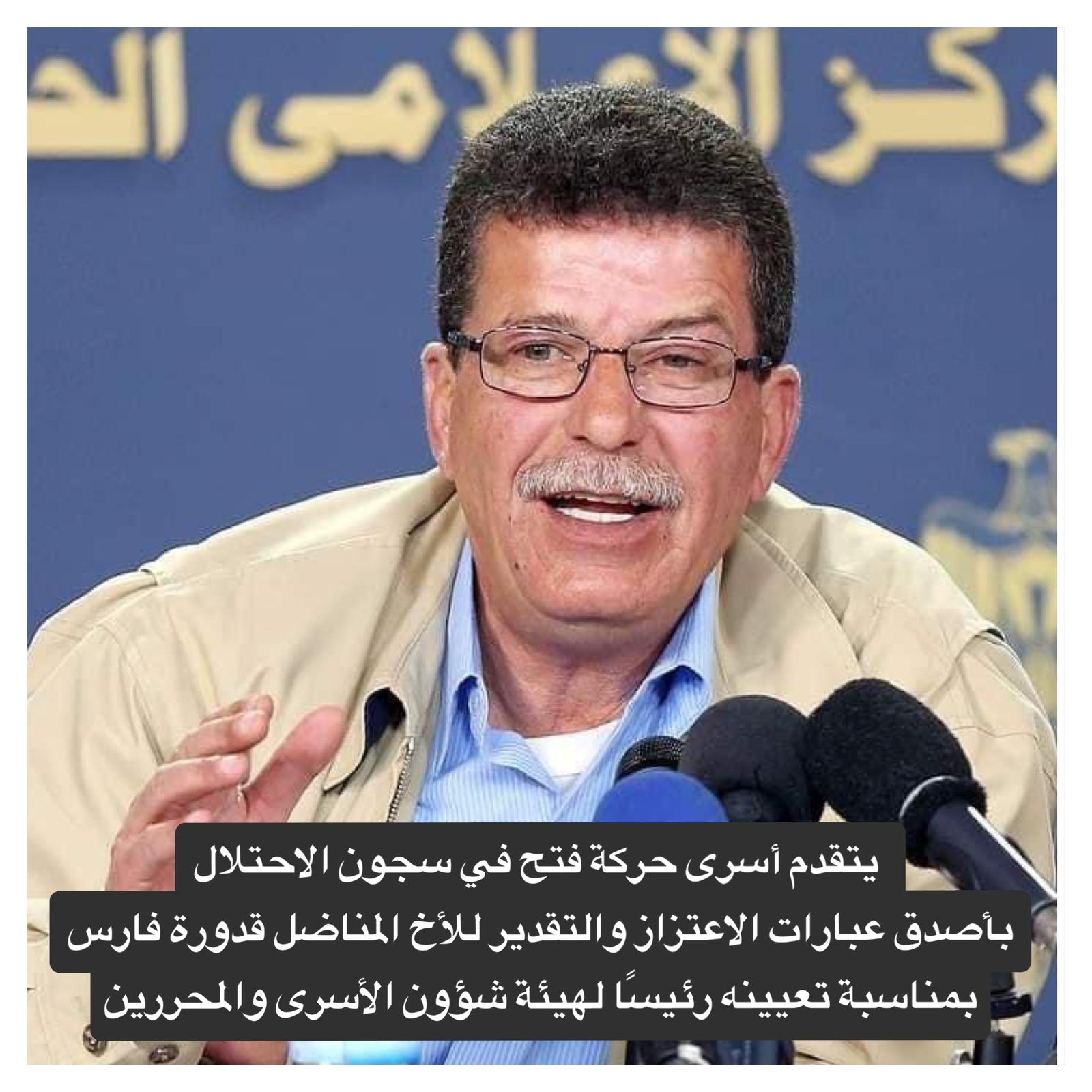 يتقدم أسرى حركة فتح في سجون الاحتلال بأصدق عبارات الاعتزاز والتقدير للأخ المناضل قدورة فارس بمناسبة تعيينه رئيسًا لهيئة شؤون الأسرى والمحررين، المزيد من التفاصيل