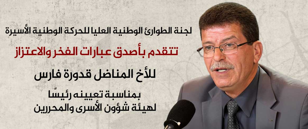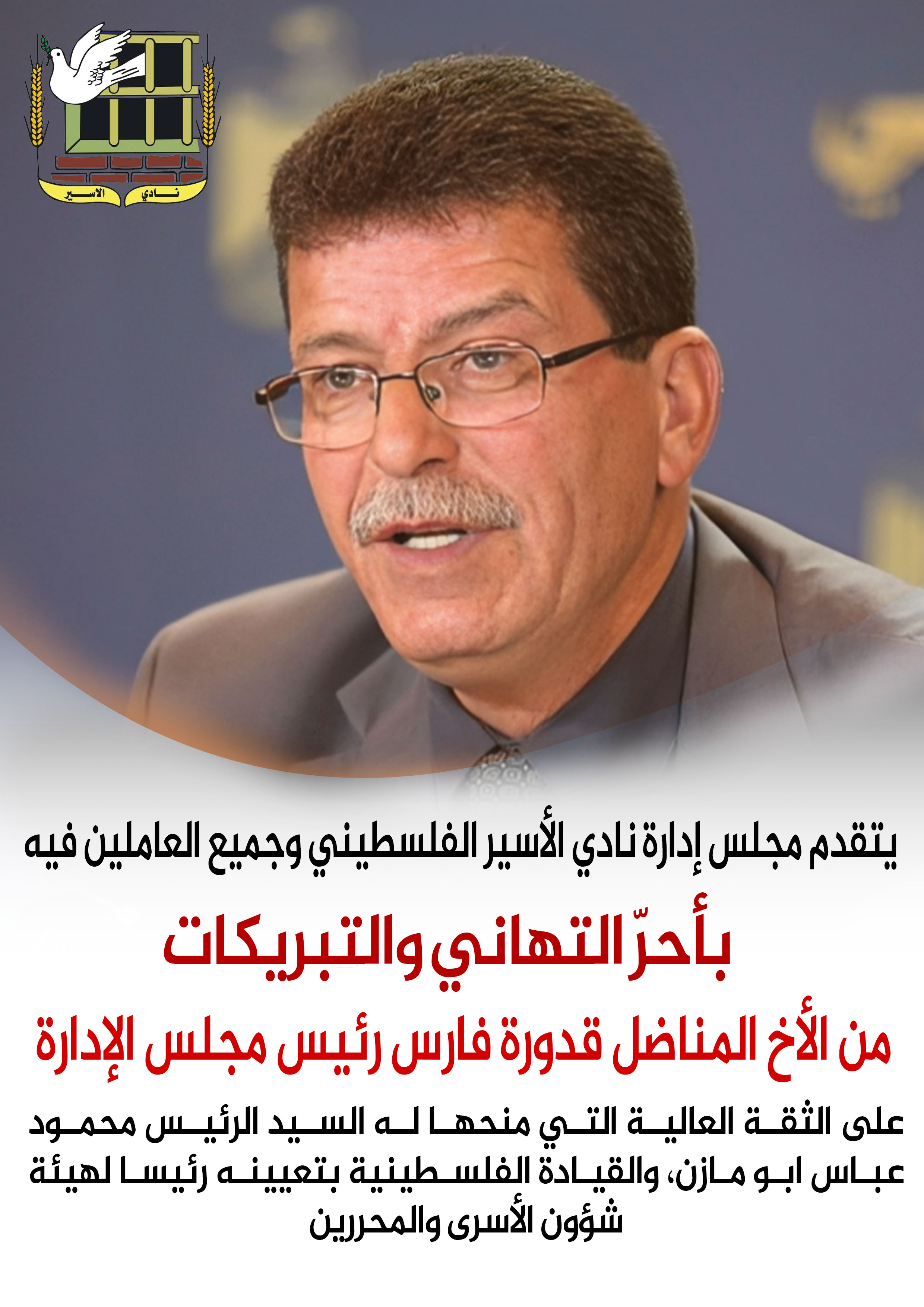 يتقدم مجلس إدارة نادي الأسير الفلسطيني وجميع العاملين فيه بأحرّ التهاني والتبريكات من الأخ المناضل قدورة فارس رئيس مجلس الإدارة المزيد من التفاصيل