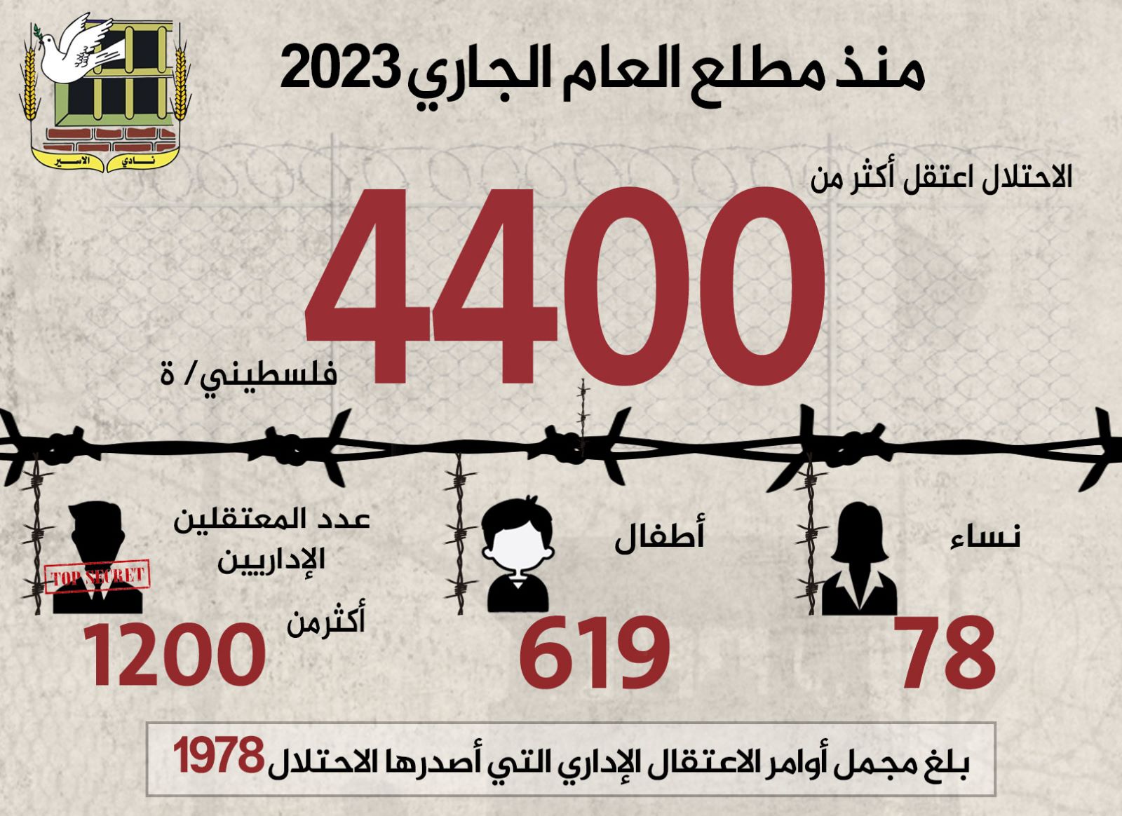 نادي الأسير: بلغت حصيلة حالات الاعتقال منذ مطلع العام الجاري، أكثر من (4400) فلسطيني/ة، بينهم (619) طفلًا، و(78) من النساء، فيما بلغ عدد أوامر الاعتقال الإداريّ (1978) أمر