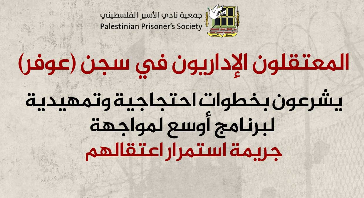 المعتقلون الإداريون في سجن (عوفر) يشرعون بخطوات احتجاجية وتمهيدية لبرنامج أوسع لمواجهة جريمة استمرار اعتقالهم