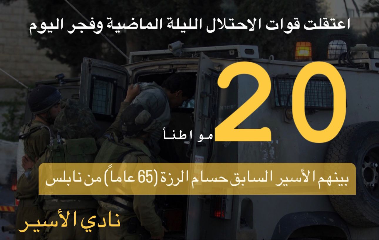 نادي الأسير: اعتقلت قوات الاحتلال الليلة الماضية، وفجر اليوم (20) مواطنًا من الضفة، بينهم الأسير السابق حسام الرزة (65 عاماً) من نابلس المزيد من التفاصيل